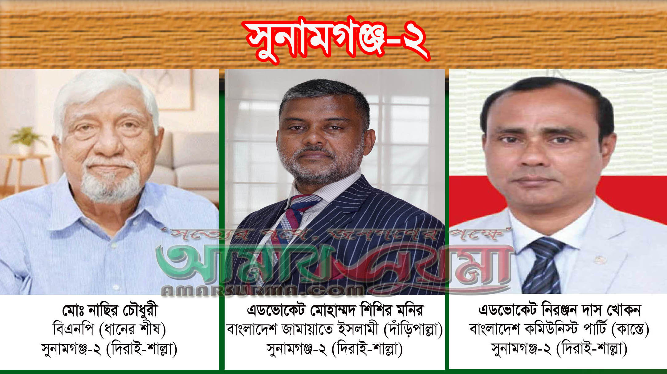 পাঁচটি সংসদীয় আসন নিয়ে গঠিত সুনামগঞ্জ জেলায় ত্রয়োদশ জাতীয় সংসদ নির্বাচনে মূল লড়াই হবে বিএনপি ও জামায়াতের মধ্যে। তবে দুটি আসনে বিএনপির মনোনয়ন বঞ্চিত স্বতন্ত্র প্রার্থী মূল প্রতিদ্বন্দ্বীতায় চলে আসার আভাস মিলছে। এ ক্ষেত্রে এই আসনগুলোতে ত্রিমুখী লড়াই হতে পারে। এ পর্যন্ত যে আভাস পাওয়া গেছে, তাতে তিনটিতে দ্বিমুখি ও দুইটিতে ত্রিমুখি প্রতিদ্বন্দ্বীতা হবে বলে মনে করেন সাধারণ ভোটার ও নির্বাচন বিশ্লেষকগণ। জাতীয় নির্বাচনকে কেন্দ্র করে উত্তাপ ছড়িয়ে পড়েছে হাওরবেষ্টিত জেলা সুনামগঞ্জের পাঁচটি সংসদীয় আসনে। শেষ মুহূর্তের প্রচার-প্রচারণায় জমে উঠেছে নির্বাচনী মাঠ। শুরুতে এই জেলাটি বিএনপির একচেটিয়া প্রভাব বলয়ে থাকলেও সময় গড়ানোর সঙ্গে সঙ্গে দৃশ্যপট পাল্টাতে শুরু করেছে। ধানের শীষের প্রার্থীদের চ্যালেঞ্জ ছুড়ে দিচ্ছেন জামায়াতে ইসলামী ও শক্তিশালী স্বতন্ত্র প্রার্থীরা। স্থানীয় ভোটার ও বিশ্লেষকদের মতে, এবার নির্বাচন কেবল দলীয় লড়াই নয়; বরং ব্যক্তি ইমেজ ও আঞ্চলিকতার হিসেবেও রূপ নিচ্ছে। বিশেষ করে বিএনপির অভ্যন্তরীণ কোন্দল এবং বিদ্রোহী প্রার্থীদের উপস্থিতি দলটিকে ভাবিয়ে তুলছে। অন্যদিকে, এই সুযোগ কাজে লাগিয়ে তৃণমূল পর্যায়ে নিজেদের অবস্থান শক্ত করছে জামায়াত ও স্বতন্ত্র প্রার্থীরা।